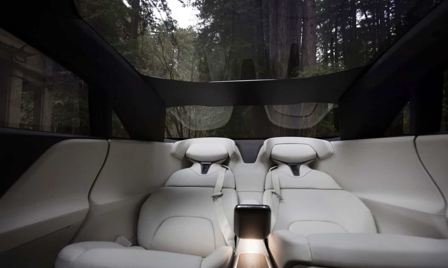 La parte trasera es la que más me ha llamado la atención ya que monta un conjunto de asientos traseros reclinables rematados en cuero blanco, rodeados de cristal y de pantallas repletas de cosas interesantes. En la parte delantera nos topamos con un salpicadero minimalista dominado por pantallas con toda la información relevante para el conductor.