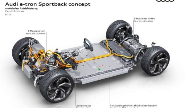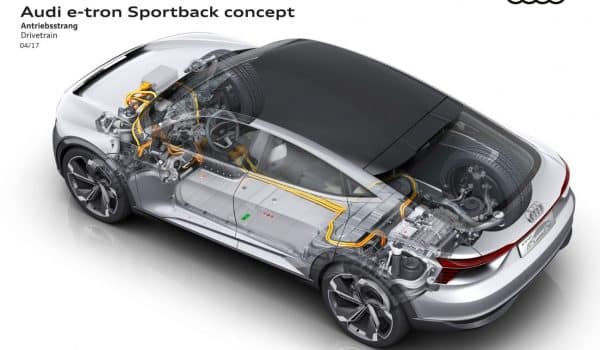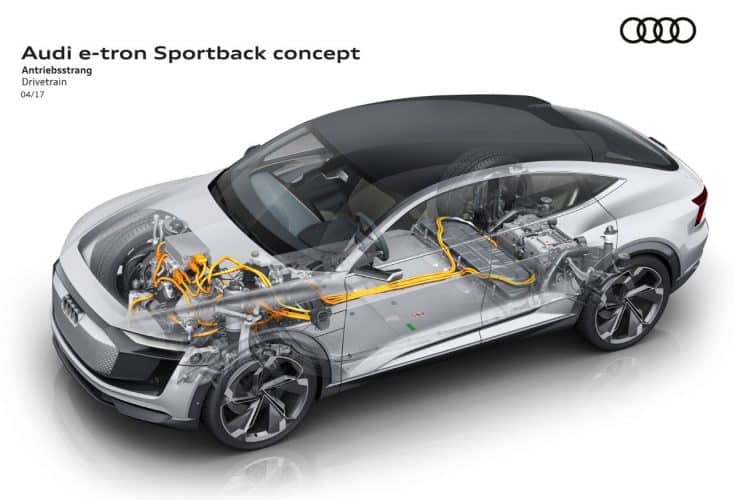 Para su conducción, el e‑tron Sportback utiliza una configuración que también va a ser adoptada en los futuros modelos de producción en serie de Audi, la propulsión cien por cien eléctrica: un motor eléctrico en el eje delantero y otros dos en el trasero mueven las cuatro ruedas, transformando a este coupé de altas prestaciones en un coche con tracción quattro, al más puro estilo Audi. Los 320 kW (435 CV) de potencia, que pueden llegar a ser 370 kW (503 CV) en el modo boost, proporcionan un excelente empuje, con una aceleración de 0 a 100 km/h que se realiza en sólo 4,5 segundos.