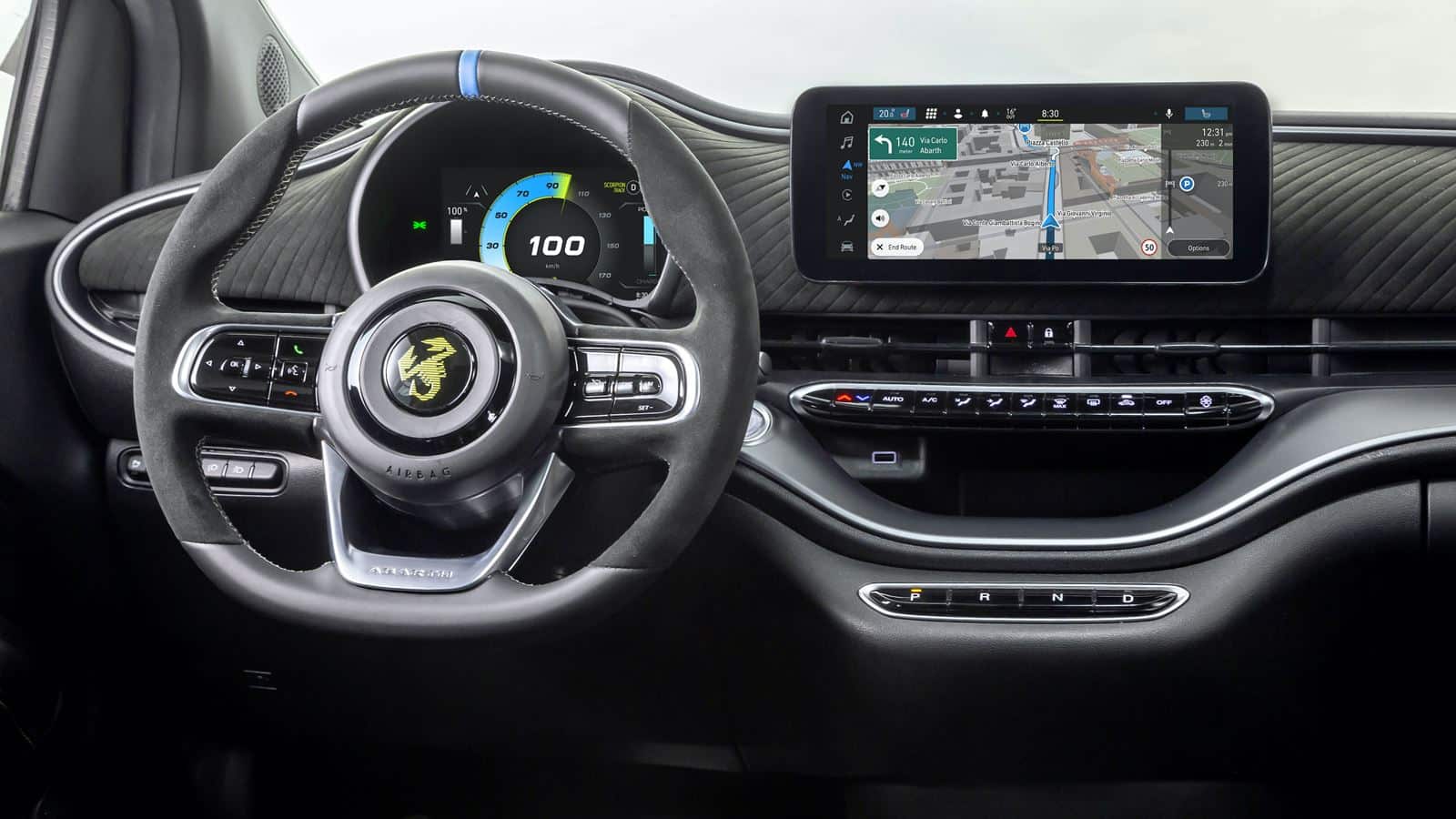 La exclusividad y deportividad de los materiales también se aprecia en el nuevo salpicadero estampado en Alcantara. El cuero de alta calidad con apliques de Alcantara y el logo del Escorpión embellecen el volante deportivo de tres radios. Los excelentes paneles de puerta y el reposabrazos del túnel central presentan una deportiva costura doble.