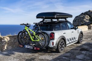 Junto con el nuevo juego de llantas y neumáticos, también está disponible un portabicicletas trasero plegable que puede transportar cómodamente dos bicicletas de montaña. Eso sí, sin duda alguna lo más interesante es la carpa de techo para el Cooper S Countryman ALL4 desarrollada por Autohome.