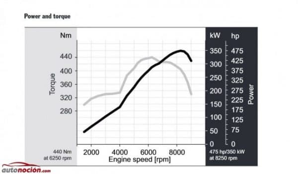 Potencia del motor: 475 CV (350 kW) a partir de 8.250 r.p.m.