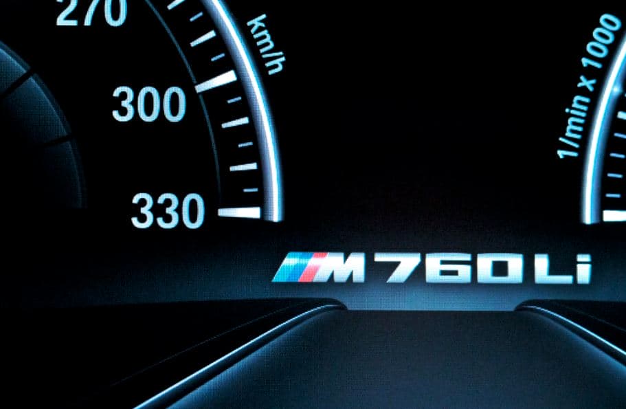 BMW M Performance y su inconfundible carácter está presente en el habitáculo. El volante M recubierto de piel lleva el logotipo M. Las teclas de funciones múltiples en los radios del volante son de acabado cromado brillante aperlado. En el dorso del volante se encuentran las levas para cambiar de velocidades manualmente. Las molduras con el distintivo V12 iluminado en los umbrales de las puertas permiten intuir el placer que significa conducir el nuevo modelo de la Serie 7 de BMW. El tablero de instrumentos incluye un velocímetro exclusivo, en el que se puede apreciar la denominación del modelo y que cuenta con una escala que llega hasta los 330 km/h.