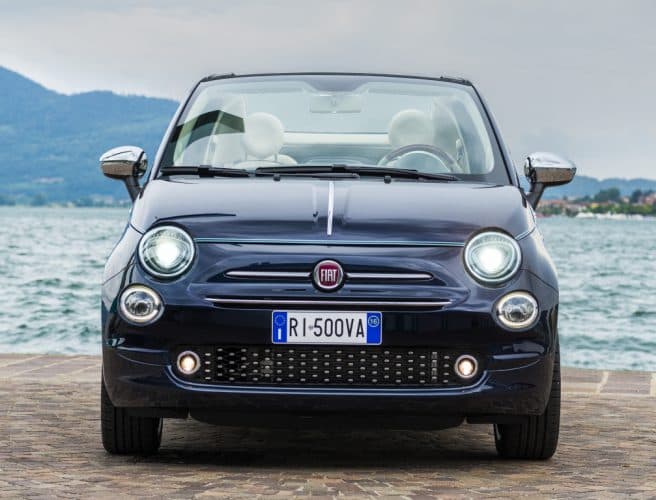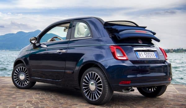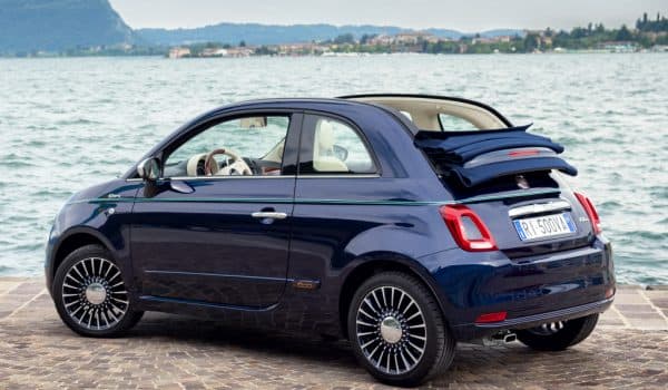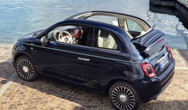 Exteriormente el nuevo 500 «Riva» se reconoce por la pintura azul «»Sera Blue» específica que se combina con una línea verde que recorre la línea de cintura. La capota de lona de accionamiento eléctrico va tintada en azul mientras que los espejos emplean carcasas cromadas.