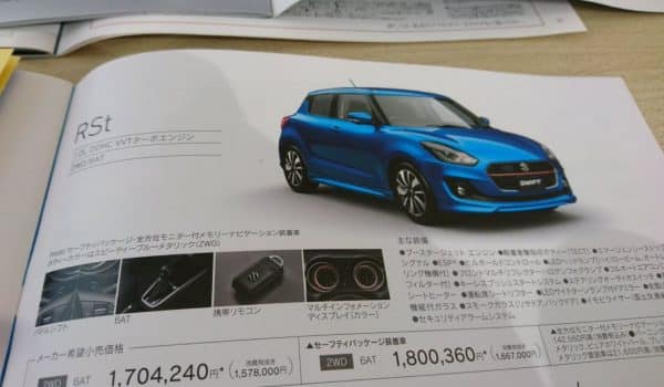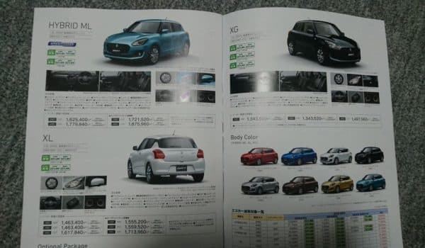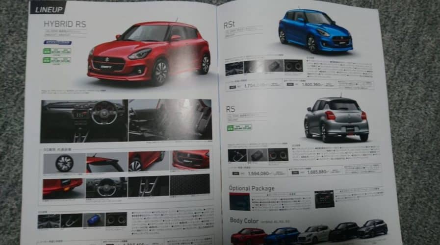 Sí, tenemos capturas del folleto de la variante japonesa del Swift y parece que pinta muy pero que muy bien. Para hacernos una idea de la información hasta ahora conocida, el Suzuki Swift japonés cuenta con nada menos que seis versiones: XG, XL, ML hybrid, RS, Rst y RS hybrid.