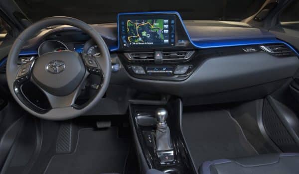 En el interior encontramos un tapizado en piel negro con pespuntes en azul, climatizador automático de dos zonas, sistema de navegación Toyota Touch&Go con pantalla de ocho pulgadas, bluetooth, puerto USB, cámara de visión posterior, control de crucero adaptativo, sensor de lluvia y encendido automático de luces.