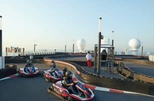 La pista de karts del Norwegian Bliss se encuentra en la parte superior de la cubierta 19 y cuenta con karts eléctricos capaces de alcanzar los 48 km/h, una velocidad muy elevada para una pista tan ratonera.