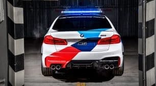 La transformación del BMW M5 en un vehículo de seguridad de MotoGP se completó con la inclusión de necesidades especiales para las carreras y el equipo de seguridad necesario. El difusor frontal es un prototipo desarrollado específicamente para el BMW M5 MotoGP Safety Car. Los pestillos del capó se derivan directamente de las carreras. Los asientos deportivos del BMW M4 GTS garantizan una combinación de comodidad y máxima seguridad para sus ocupantes al entrar en acción sobre la pista. La barra de luces en el techo utiliza la moderna tecnología LED y se controla a través de un panel en el habitáculo especialmente desarrollado.