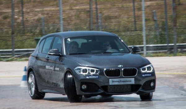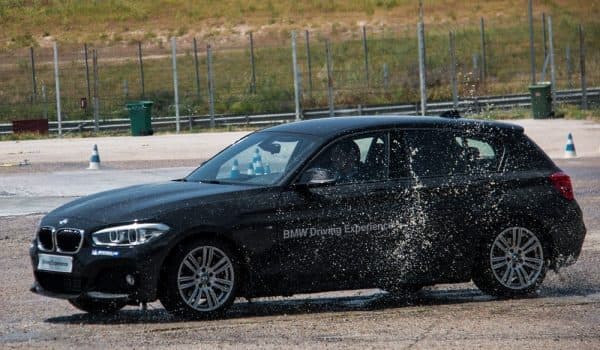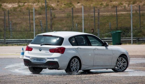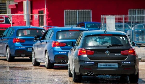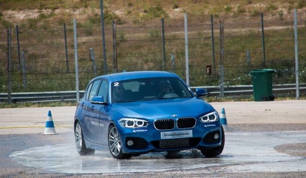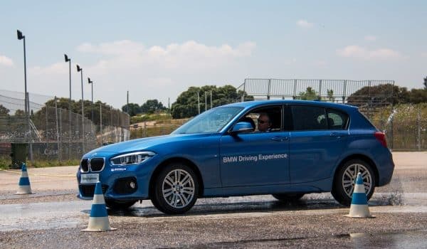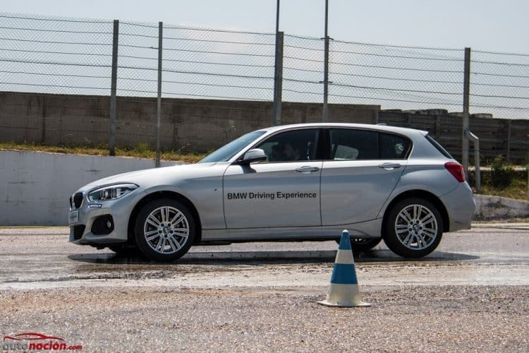 Una vez finalizada la charla, nos dirigimos a la zona de suelo mojado para comprobar la función del DSC (Control Dinámico de Estabilidad) a los mandos de un BMW Serie 1. El ejercicio consiste en pisar a fondo el acelerador durante un giro, primero con los controles desactivados y, en una segunda pasada, con ellos activados, siempre sin corregir la trayectoria.