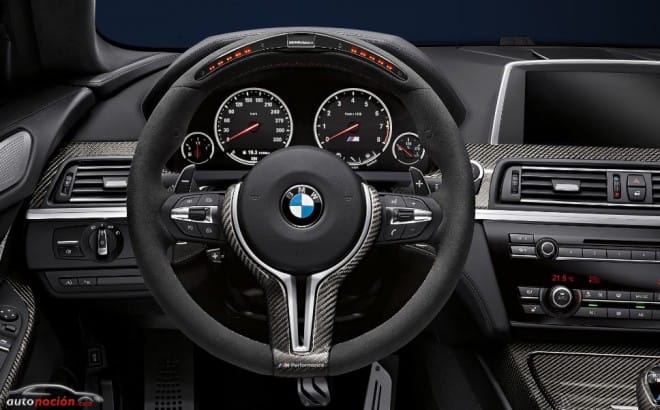 Embellecedores y remates BMW M Performance: Para el puesto de mando BMW M Performance incluye un embellecedor en fibra de carbono para el selector de marchas de la transmisión de doble embrague, embellecedores interiores en fibra de carbono, pedales de acero inoxidable y alfombrillas BMW M Performance. El exterior de los modelos BMW M5, BMW M6 Coupé, BMW M6 Cabrio y BMW M6 Gran Coupé se puede personalizar aún más mediante las carcasas de los espejos retrovisores exteriores realizadas en fibra de carbono, una rejilla frontal BMW M Performance en negro de alto brillo y láminas BMW M Performance diseñadas de manera exclusiva para cada modelo en particular.