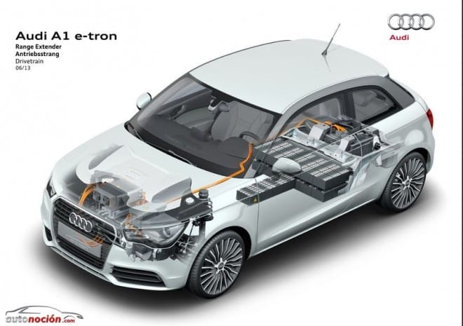 La batería de iones de litio en forma de T del Audi A1 e-tron, con una capacidad energética de 13,3 kWh, garantiza una autonomía en modo eléctrico de 50 km; en un enchufe doméstico de 220 V, la batería se carga por completo en unas tres horas. En marcha, un compacto y ligero motor Wankel de un solo rotor ubicado en la parte posterior del vehículo incrementa la autonomía hasta los 250 km; con 34 CV (25 KW) de potencia, este range extender no tiene conexión mecánica con las ruedas del vehículo, sino que se encarga de mover un alternador que suministra carga a la batería.