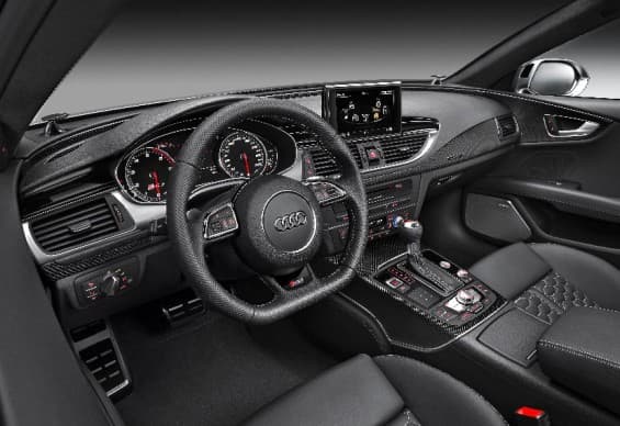 La elegancia dinámica se extiende hasta el cockpit del Audi RS 7 Sportback. Los instrumentos redondos presentan esferas negras, cifras blancas y agujas rojas; y una expresiva inscripción RS 7 colocada sobre el cuentarrevoluciones pone el acento especial. Asimismo, la llave, el volante achatado de cuero en diseño de tres radios, las molduras de entrada iluminadas y los indicadores del MMI y el sistema de información al conductor (FIS) incorporan emblemas RS. En el FIS, un piloto luminoso indica cuándo se ha alcanzado el par motor límite, y otros indicadores para la presión de carga y la temperatura del aceite, así como un laptimer para cronometrar los tiempos de las vueltas en un circuito de competición, completan el menú específico del RS 7 Sportback.