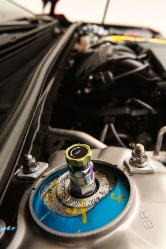 Para mejorar la frenada y la disipación de calor de los componentes del sistema de frenos se ha instalado un kit de frenos sobredimensionado Stoptech ST40. Las pinzas de aluminio de cuatro pistones exprimen unas pastillas Hawk Performance DTC-60 que aplican fricción a los grandes discos ranurados Stoptech de 355 mm.