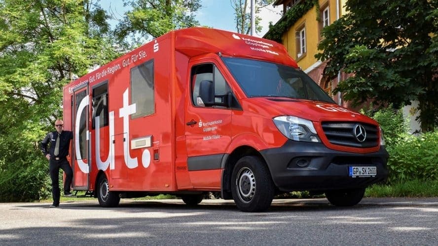 Pensemos en las furgonetas que reparten el pan por los pueblos, o los antiguos camiones de helados ¿Por qué no un banco sobre ruedas? Pues dicho y hecho, el Göppingen Savings Bank ha cogido nada menos que una Mercedes-Benz Sprinter y ha montado su propia oficina móvil. A ver si con un poco de suerte la idea triunfa y lo vemos con mayor frecuencia.