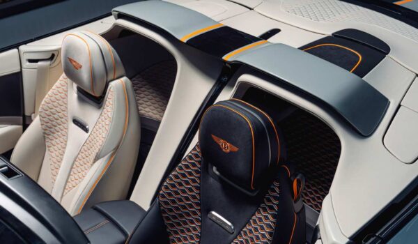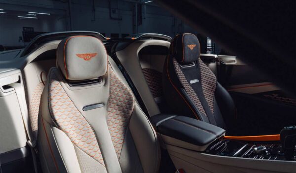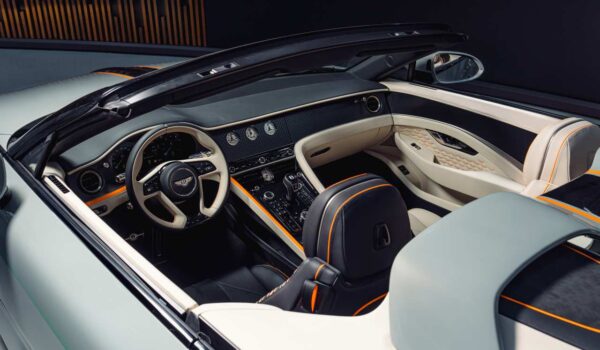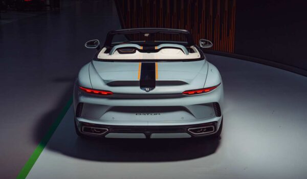 La carrocería del primer Batur Convertible está acabada en un deslumbrante tono Opalite, atravesado por una franja de competición en Beluga negro con ribetes Mandarin que recorre el capó, el “airbridge” del habitáculo y la cubierta trasera.