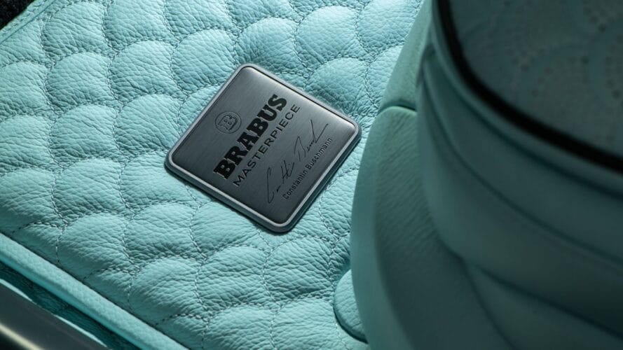 El interior ha sido catalogado como una BRABUS Masterpiece. Está hecho a medida y completamente a mano. El exclusivo diseño de cuero en «Azul Turquesa», refinado hasta el más mínimo detalle, impresiona por su acabado impecable con un acolchado especial BRABUS «Seashell Diamond» y ribetes negros, elementos de adorno y alfombrillas, también revestidos con los mejores cuero.