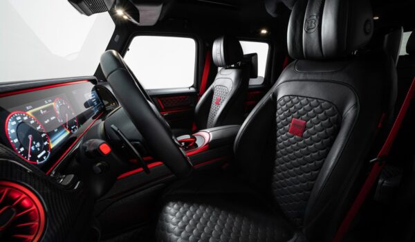 Ninguna obra maestra de BRABUS estaría completa sin un diseño interior hecho a mano y hecho a medida. El diseño de cuero de dos tonos, refinado hasta el más mínimo detalle, combina el negro con el rojo cohete e impresiona con su acabado impecable, que presenta un patrón acolchado especial BRABUS «Seashell Diamond» y perforaciones en los asientos. También se instalaron alfombrillas acolchadas de cuero para dar un toque aún más refinado.