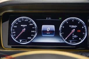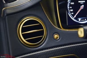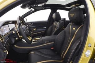 El diseño del interior es espectacular y se asemeja al del Mercedes-Maybach, pero con un volante de corte más deportivo y algunos detalles que evocan mayor dinamismo a la hora de ponerse al volante, lo que hace que los pasajeros disfruten del máximo lujo y deportividad que sólo Brabus puede ofrecer. No faltan los asientos tapizados en cuero negro con contrastes en color oro y multitud de elementos ornamentales en esta misma tonalidad.