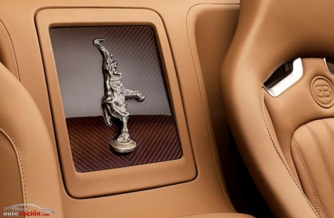 El habitáculo está totalmente tapizado en piel en color «Cognac» y para rematar el lujoso interior y darle un toque que lo haga digo de estar en Les Legendes de Bugatti, la marca ha reproducido el famoso elefante en el hueco existente entre los dos asientos.