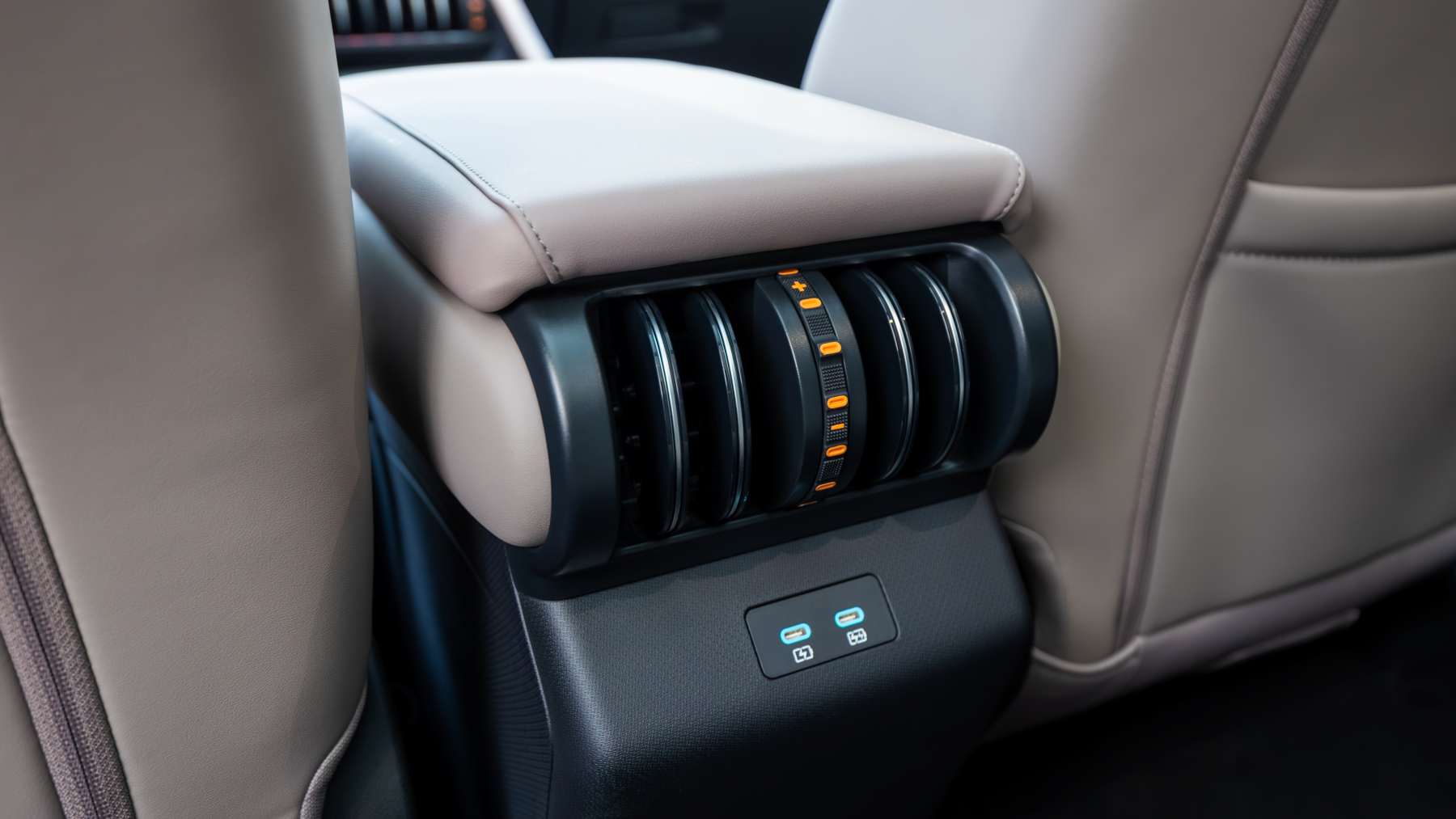 El cargador inalámbrico de hasta 50W con refrigeración es potente y útil. Cuatro puertos USB-C delante (dos de 60W y dos de 18W) y otros dos detrás dejan claro que este coche está pensado para un uso familiar moderno.