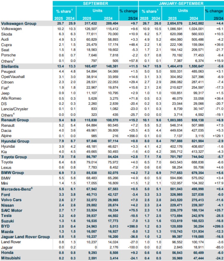 Mientras tanto, Tesla enfrenta una desaceleración en sus ventas europeas. En septiembre, la marca estadounidense registró 39.837 vehículos, una caída del 10,5% interanual. En la Unión Europea, el descenso fue aún más marcado, con una bajada del 18,6% (25.656 unidades frente a 31.535 el año anterior).