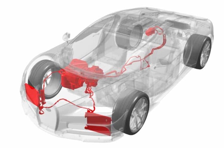 En el caso de Bugatti hay dos condensadores de aire acondicionado que aseguran la disipación de calor del vehículo, una unidad central de aire acondicionado que responsable del control y un compresor que acciona todo el sistema. Este sistema está compuesto por líneas de aire acondicionado con una longitud de aproximadamente 9,5 metros en total debido al concepto de motor montado en el medio.