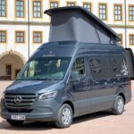 La primera de ellas se ubica en la parte trasera y es capaz de desplegarse eléctricamente en menos de 40 segundos. Nos ofrece un espacio adicional de 2,07 metros de largo y 1,40 metros de ancho, albergando una cama doble. Cuando vamos a circular, se introduce en la carrocería para acortar la distancia total de la Sprinter. La segunda es el mítico techo desplegable que libera un mayor espacio para la cabeza.