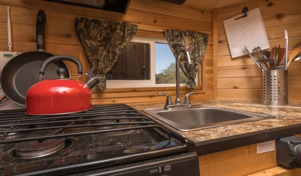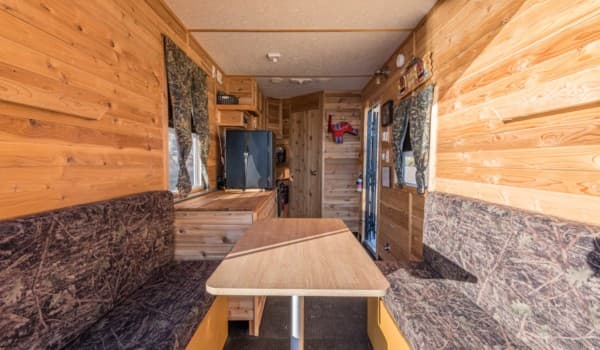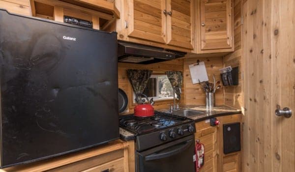 La cocina del Heidi-Ho es pequeña, pero está relativamente bien equipada. No falta una estufa de propano de tres fuegos, un horno, una nevera y un fregadero. Al lado encontramos un baño con inodoro de compostaje. La sala de estar / comedor, por su parte, tiene una mesa y un par de banquetas que se pueden convertir en una cama doble.