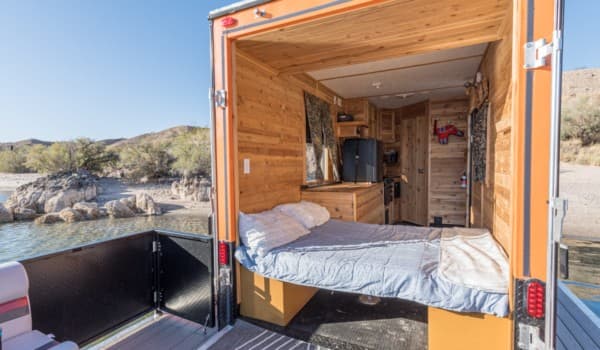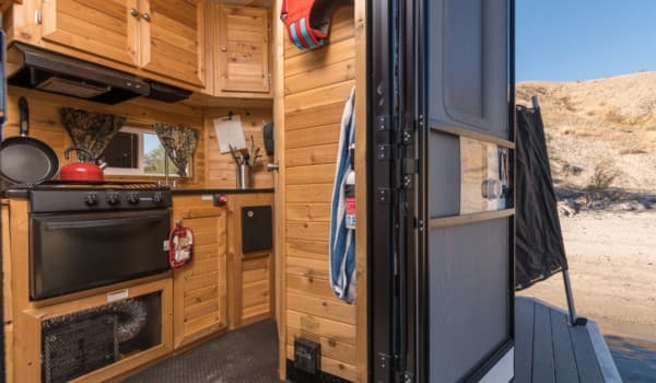 También hay una litera arriba y todo el área se puede abrir al exterior gracias a una pared trasera desplegable. Rematan el conjunto una ducha al aire libre y sillas plegables para la cubierta. La energía procede de un panel solar de 175 vatios instalado en el techo, que está conectado a un par de baterías.