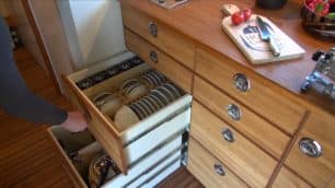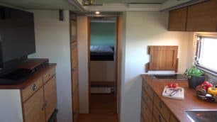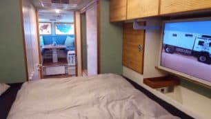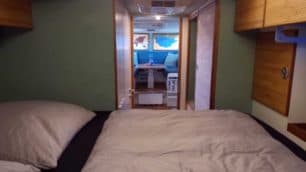 No se especifican los detalles con respecto al abastecimiento de energía eléctrica o la capacidad de agua dulce, pero sí que sabemos que cuenta con una cocina de gran tamaño con quemadores, horno, refrigerador, congelador y microondas. Hay una generosa mesa de comedor en la sala de estar/dormitorio de la parte delantera y una enorme cama doble en el dormitorio de la parte posterior.