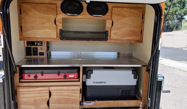 Otros elementos estándar son la luz de lectura, un ventilador de 12 V, la cama de matrimonio (152 x 203 cm) que se dobla como un pequeño asiento cuando se pliega hacia atrás y la cocina, que es totalmente personalizable en términos de diseño y elementos. La encimera de acero inoxidable y el quemador de gas Camp Chef vienen de serie, pero hay múltiples opciones.
