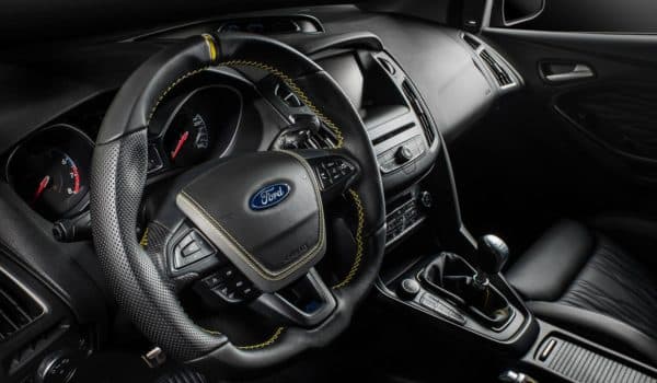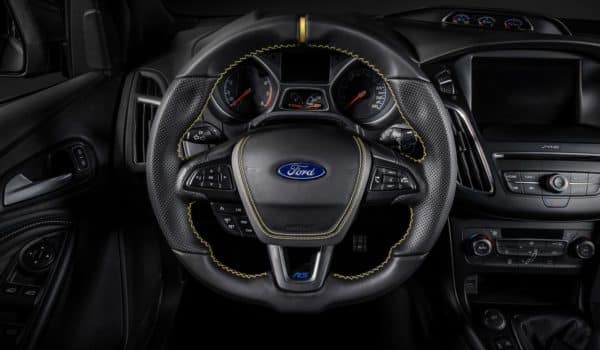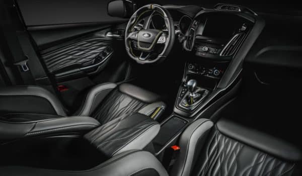 Ahora todo el interior ha sido actualizado con una elegante tapicería de cuero negro con costuras en contraste de color amarillo, así como los asientos y paneles de las puertas que reciben una «costura dinámica» para enfatizar el «estilo rally» del Focus RS. Uno de los elementos que más destacan del interior es el volante, el cual recibe un nuevo diseño más deportivo y un acabado en cuero perforado con costuras en amarillo.