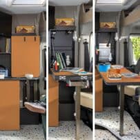 - Office: kit comedor/escritorio frontal, mesa extensible, tomas de corriente adicionales, soporte para monitor de 24 pulgadas, pack LED interior, caja de seguridad