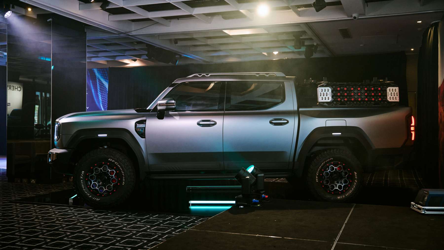 El frontal y la zaga presumen de un logo CHERY de gran tamaño, acompañado de elementos típicos del mundo off-road como el snorkel, los neumáticos all-terrain bastante generosos y accesorios orientados a la aventura. Todo ello rematado con un acabado en gris mate que refuerza ese aire de robustez.