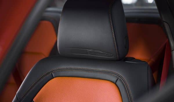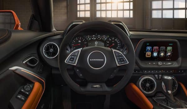 En el interior encontramos numerosos guiños a Hot Wheels, como acentos de color naranja en la tapicería de cuero negro, costuras decorativas, y los cinturones de seguridad. Otros de los detalles más llamativos del habitáculo son los reposacabezas con un dibujo del Camaro, las placas de las puertas iluminadas o insignias decorativas de Hot Wheels en el volante para completar este paquete visual.
