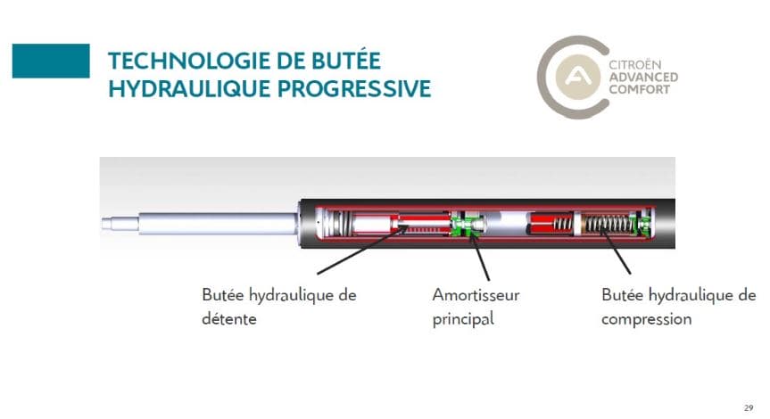 Mientras que un sistema de suspensión convencional se compone de amortiguadores, muelles y topes mecánicos, el nuevo sistema de Citroën añade dos amortiguadores hidráulicos progresivos – uno para el rebote y otro para la compresión – en la parte superior e inferior de cada unidad de suspensión.