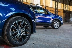El Ford Edge, por su parte, cuenta con un ángulo de ataque de 18,8º, un ángulo ventral de 17,1º, un ángulo de salida de 22,4º, llantas de 20 pulgadas y una altura libre al suelo de 20,3 centímetros, lo que nos permite afrontar caminos de baja dificultad sin disgustos, pero a la hora de superar obstáculos la cosa se complica. También carece de reductora, control de descenso de pendientes y un amplio recorrido de suspensiones, pero sí que ofrece tracción total conectable automáticamente a través de un embrague ubicado a la entrada del diferencial trasero.