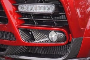 Probablemente, lo primero que os venga a la cabeza al ver la parte trasera de este Cayenne sea un robot. La combinación de la fibra de carbono con un color rojo tan vivo en la carrocería le dan un aspecto un tanto peculiar, al tiempo que el alerón, el spoiler de la tapa del maletero y la doble salida de escape desvían nuestra atención. Y claro, no menos discretas son las enormes llantas negras que rematan el conjunto. Desde luego, no me imagino haciendo off-road con semejante elemento…