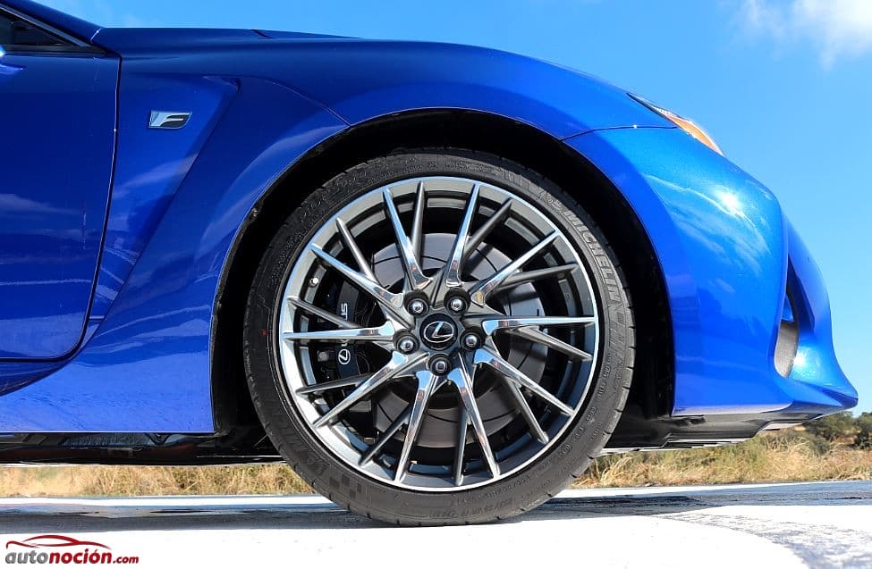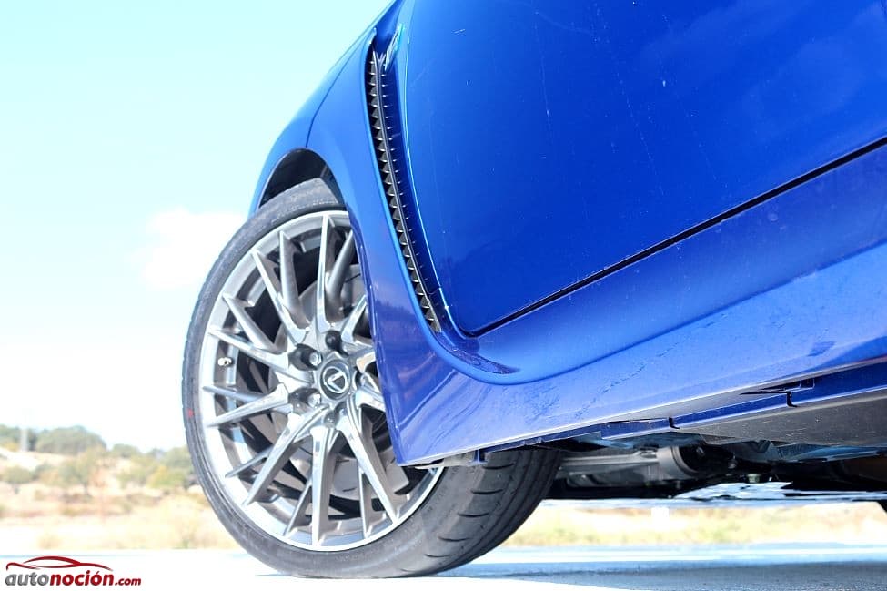 El diseño lateral se remata en nuestra unidad con unas atractivas llantas de aleación oscurecidas de 19” Forged High+. Se trata de unas llantas de radios mecanizados con técnicas tridimensionales pulidas a mano. Estas preciosas llantas de aleación montaban unos neumáticos Michelin Pilot Super Sport en dimensiones 255/35 ZR 19 92Y en la delantera y unos 275/35 ZR 19 96Y en la trasera. Las espectaculares llantas ocultan un sistema de frenos de frenos de disco en las cuatro ruedas. Brembo ha sido el encargado de diseñar y fabricar en exclusiva para Lexus este sistema de frenos compuestos de pinzas de 6 pistones delante y 4 pistones detrás que frenarán unos discos delanteros de 380 mm delante y unos de 345 mm detrás. Tanto los discos delanteros como los traseros son rayados y se complementan con un sistema antibloqueo de frenos (ABS), un distribuidor electrónico de la fuerza de frenada (EBD) y un asistente de frenada (BA).