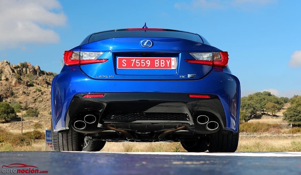 El diseño del RC F parece asentarse aún más en la carretera gracias a una parte inferior trasera ensanchada. El paragolpes trasero ha sido diseñado para no romper con la estética abultada de los generosos pasos de rueda. La parte central inferior del paragolpes trasero cuenta con una zona oscurecida en color contraste en la que podemos apreciar la presencia de una salida de escape cuádruple que escolta una rejilla de aireación central que a su vez actúa como difusor de aire.
