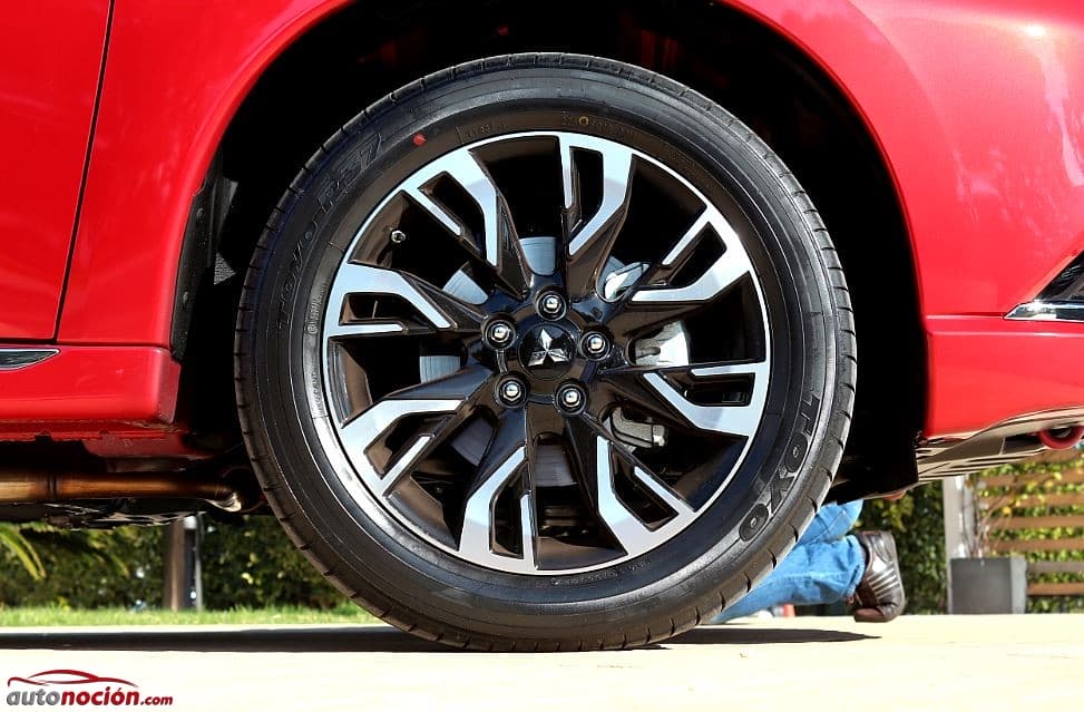 Los generosos pasos de rueda enmarcados en una superficie en color contraste que rodea la zona inferior de la carrocería albergaban unas llantas de aleación específicas del PHEV con acabado cepillado y bicolor que montaban neumáticos Toyo R37 en dimensiones 255/55 R18 98H. Sinceramente, creo que hay gomas que pueden mejorar notablemente el comportamiento del Outlander pero esta, no es una de ellas. Si te gustan las salidas al campo te recomiendo encarecidamente que busques otras cubiertas y cuando optes por un neumático de reemplazo, mejor que busques otro modelo.