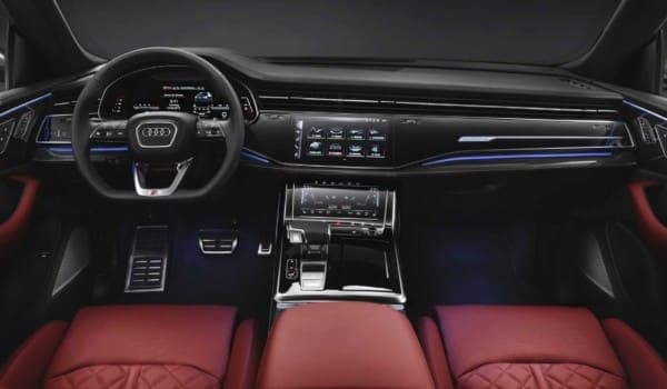 En el interior, los asientos del SQ8 están tapizados en cuero y Alcántara, incorporando los logotipos ‘S’ grabados. Encontramos también umbrales de las puertas específicos y pedales de acero inoxidable, así como algunos cambios menores en diversos elementos, como el cuadro de instrumentos, donde se puede leer Audi SQ8.