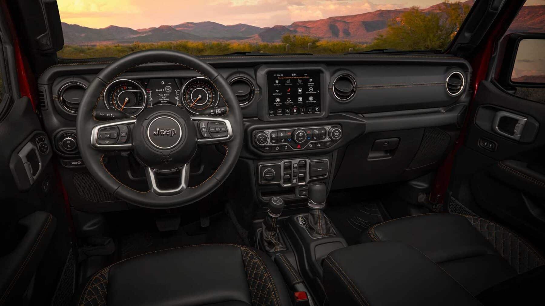 En el interior, los compradores pueden elegir entre un interior negro o gris acero. Los asientos delanteros tienen almohadones más grandes y costuras en naranja. Jeep añade un modo de conducción Off-Road Plus que ajusta la respuesta del acelerador, los puntos de cambio y el control de tracción para conducir a altas velocidades en la arena o trepar lentamente por las rocas.