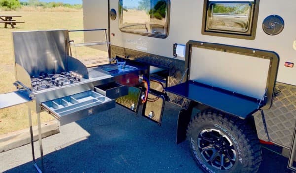 Rematan el conjunto el techo desplegable, que ofrece un mayor espacio para la cabeza, y la cocina exterior, que cuenta con un enorme refrigerador/congelador, una área de fogones de grandes dimensiones, una encimera y un fregadero con escurreplatos.