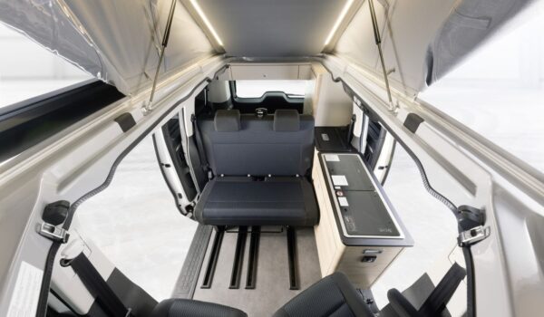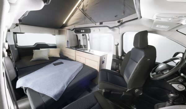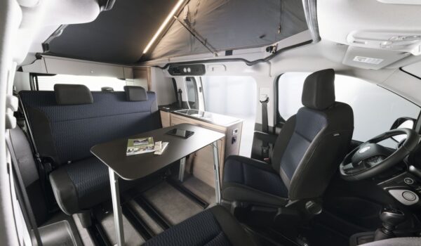 La transformación por parte de Dethleffs contempla la integración del techo retráctil que esconde una cama doble, nevera tipo arcón de buena capacidad, cocina de dos fuegos y fregadero en un mueble extraíble, armario trasero de gran tamaño, cama inferior doble, diversas luces y tomas de corriente y por supuesto el necesario aislamiento térmico.