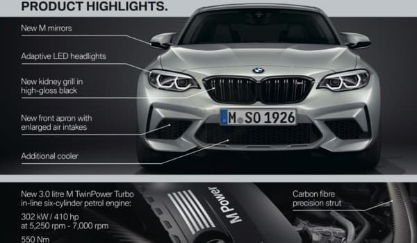 Montando el tren delantero y trasero del BMW M4, el M2 Competition se posiciona en un eslabón superior a la versión coupé, generalmente por su precisión en curvas y por lograr un motor más potente y de mejor respuesta en bajos, además de un diseño rompedor y más exclusivo que la anterior versión.