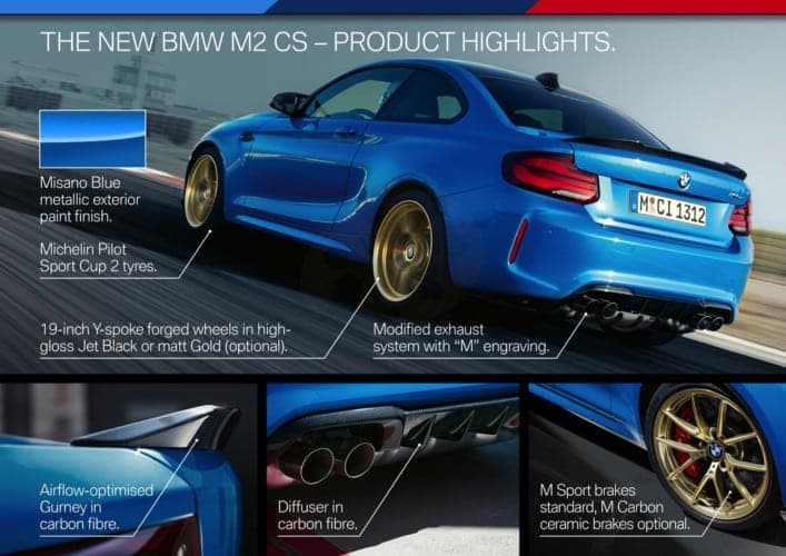 Las siglas “CS”, que corresponden a la denominación “Clubsport”, no son sino las que brindan la etiqueta al M2 más radical de los tres. Este destaca no solo por su ligera ampliación de potencia, sino por elementos en fibra de carbono que se lucen en la carrocería.
