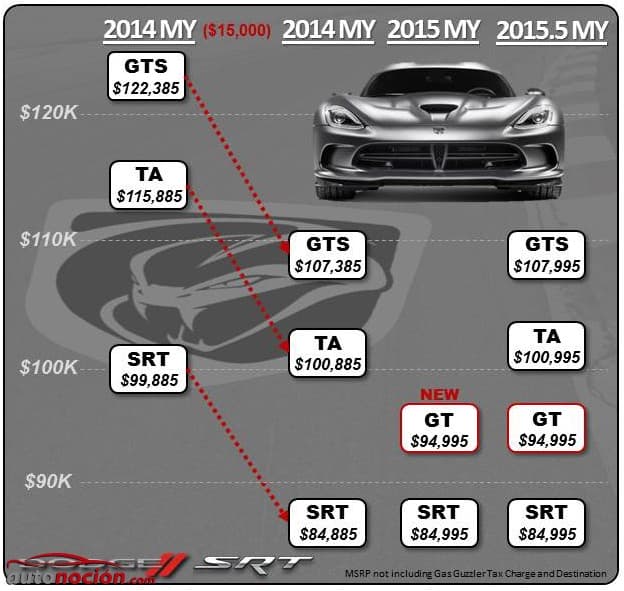 Dodge está reconfirmando su compromiso con el futuro del Viper y el reposicionamiento del deportivo americano. Detroit ha confirmado que para el 2015, dará más potencia al modelo, mejor economía de combustible y un nuevo precio de salida 15.000 dólares inferior (Un descuento de unos 11.600 euros al cambio) que el modelo 2014 al que sustituye.