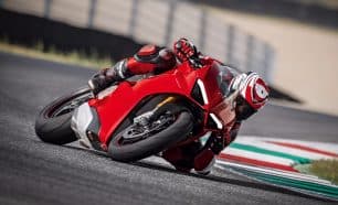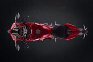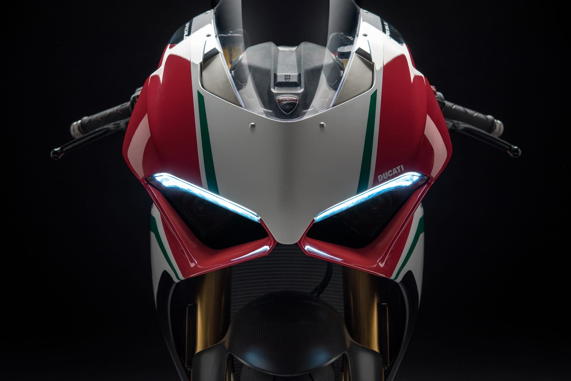 Como hemos dicho esta motocicleta de la familia Panigale guarda estrechos lazos con el MotoGP, incorporando, por ejemplo, un sistema de distribución desmodrómica o sus cilindros dispuestos formando un ángulo de 90º al igual que el Desmosedici GP o el encendido big bang. Su diámetro de 81 mm también nos da pistas de dónde ha salido semejante criatura, ya que es el máximo permitido en el reglamento de dicha competición. También equipa un sistema de admisión variable y algunos componentes reforzados para soportar un régimen de giro de hasta 13.000 rpm.