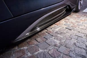 Si comenzamos por el exterior encontramos desde un capó de nuevo diseño hasta un splitter de fibra de carbono con la firma de 3D Design. En los laterales se añaden unos faldones deportivos y ya en la zaga nos topamos con un prominente difusor, también de fibra de carbono y lo más especial, un gran alerón que culmina todo el conjunto. El difusor puede ser elegido con o sin el sistema de escape que proporciona el preparador de forma opcional, aunque nos hemos quedado con ganas de escuchar su sonido. Tampoco nos olvidamos del juego de llantas de 21 pulgadas que equipa.