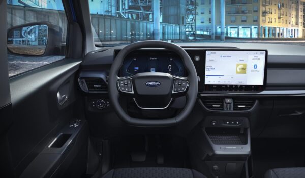 El nuevo diseño de la carrocería del E-Transit Courier ofrece una mayor capacidad de carga en todas las dimensiones. El ancho entre los pasos de rueda traseros es de 1.220 mm, lo que permite que la furgoneta compacta transporte dos europalés. El volumen total de carga es ahora de 2,9 m3, un 25 por ciento más que el modelo anterior. Esto se puede aumentar aún más utilizando la nueva función de mamparo de carga, que permite a los clientes transportar elementos como tablones o tuberías de más de 2600 mm de largo. La carga útil máxima para el modelo totalmente eléctrico es de 700 kg, con un peso máximo de remolque de 750 kg.